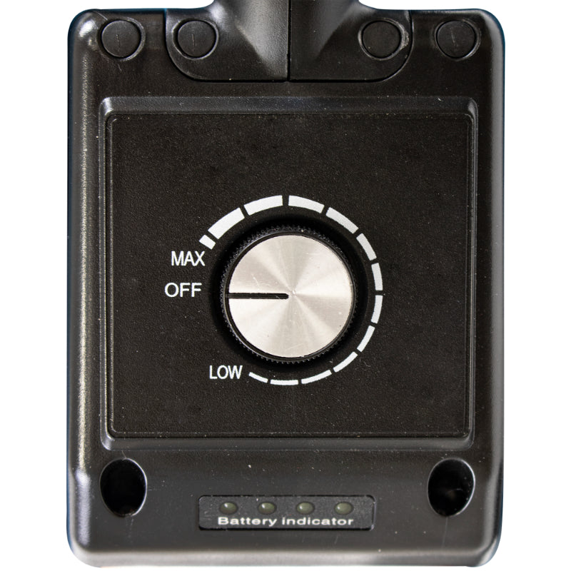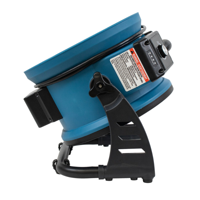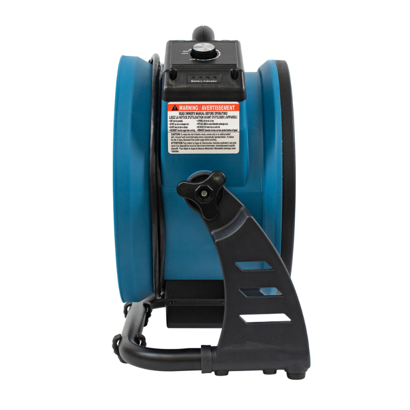The FC-150B air circulator utility dryer provides up to 1000 CFM rated airflow and only draws a maximum of 0.6 Amps from an AC outlet, and is equipped with a 18200mAh rechargeable battery. Battery run times vary but are estimated at 3 hours at full speed and 24+ hours at low speed. An LED battery-life indicator shows when you need to recharge, and you can simply plug the cord into an AC outlet when you do. With variable speed control and 360° frame rotation, you have full control over the power and direction of your airflow, and it even has a 3-hour timer.